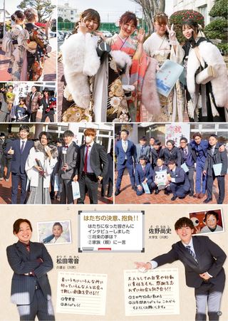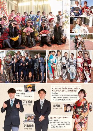 1月11日、はたちの集いが学習ホールで開かれました。久しぶりに再会した友達と記念写真を撮るなど、笑顔があふれていました。表紙は色鮮やかな振り袖に身を包み、未来に希望あふれる様子。